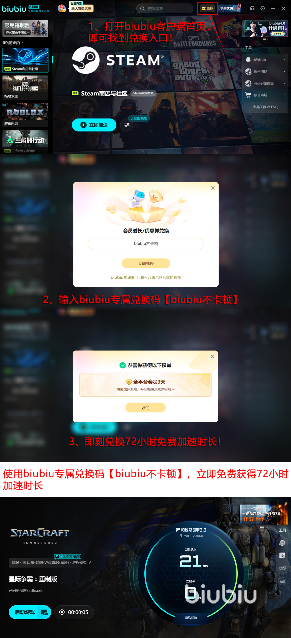 如果对biubiu在实际操作过程中的性能还不信任,那就马上注册一个新号,利用新号能免费加速24小时的福利去试用,如果感觉不够,再加上兑换码【biubiu不卡顿】能免费得到的72小时,总共96小时的时间已经完全够用了。最后一点要提醒大家,兑换码是每个号都能用的,翻出之前的老号抓紧回归吧。