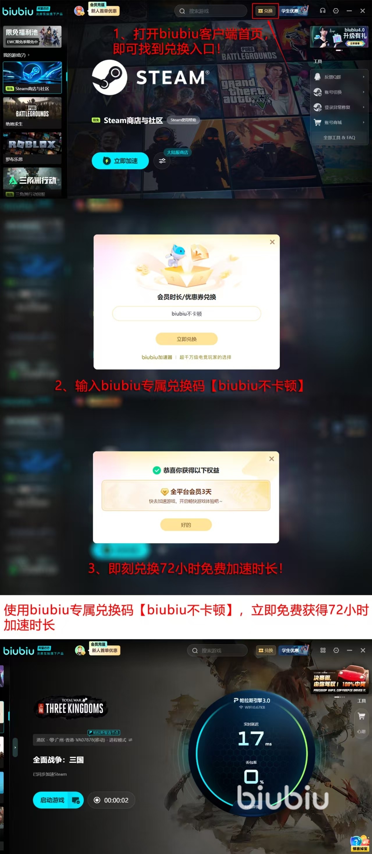 除了性能优秀外,它还非常贴心。考虑到很多玩家之前从来没用过这类工具,特意准备了新用户注册可以领取24小时免费加速时间的福利,再使用一个新老用户都能体验一次的【biubiu不卡顿】兑换码就能获得3天加速时间,新手可领取共计96小时加速时长,先体验效果再选择成为正式会员,让大家感受biubiu真实好用的效果。