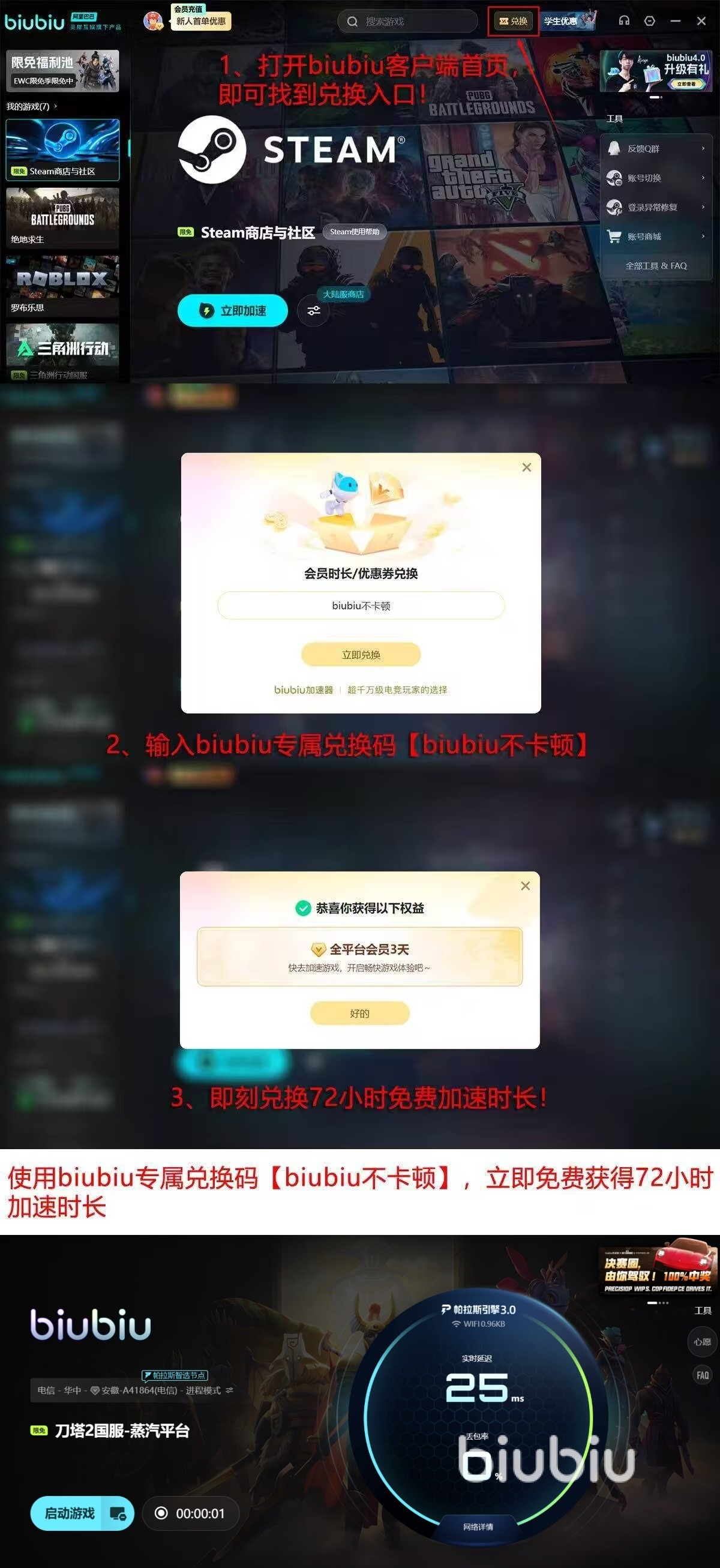 除了升级提升专业能力之外,在福利方面也做的十分贴心,针对初次使用的伙伴们来说还是有很多顾虑的,而新人第一次使用就可以拥有平台准备的24h新人免费体验福利,同时平台的所有用户在兑换界面输入【biubiu不卡顿】直接就能兑换到三天的继续免费加速时间,这个口令平台的所有用户都可以用,只要编辑的字母是正确的,就能兑换成功,但是每位用户只能够领取一次哦。
