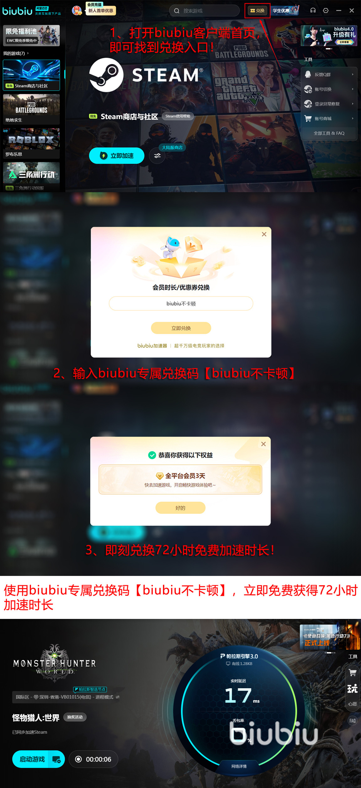 为了广大用户都能体验到本次的升级,官方决定给每位新注册的用户,发放免费24的游戏加速时长。同时还有一个兑换码活动,现在使用【biubiu不卡顿】兑换码,可免费领取72小时的免费加速时长,也就新人最高可享96小时。不过老用户也不要伤心,兑换码对于老用户也有效的。