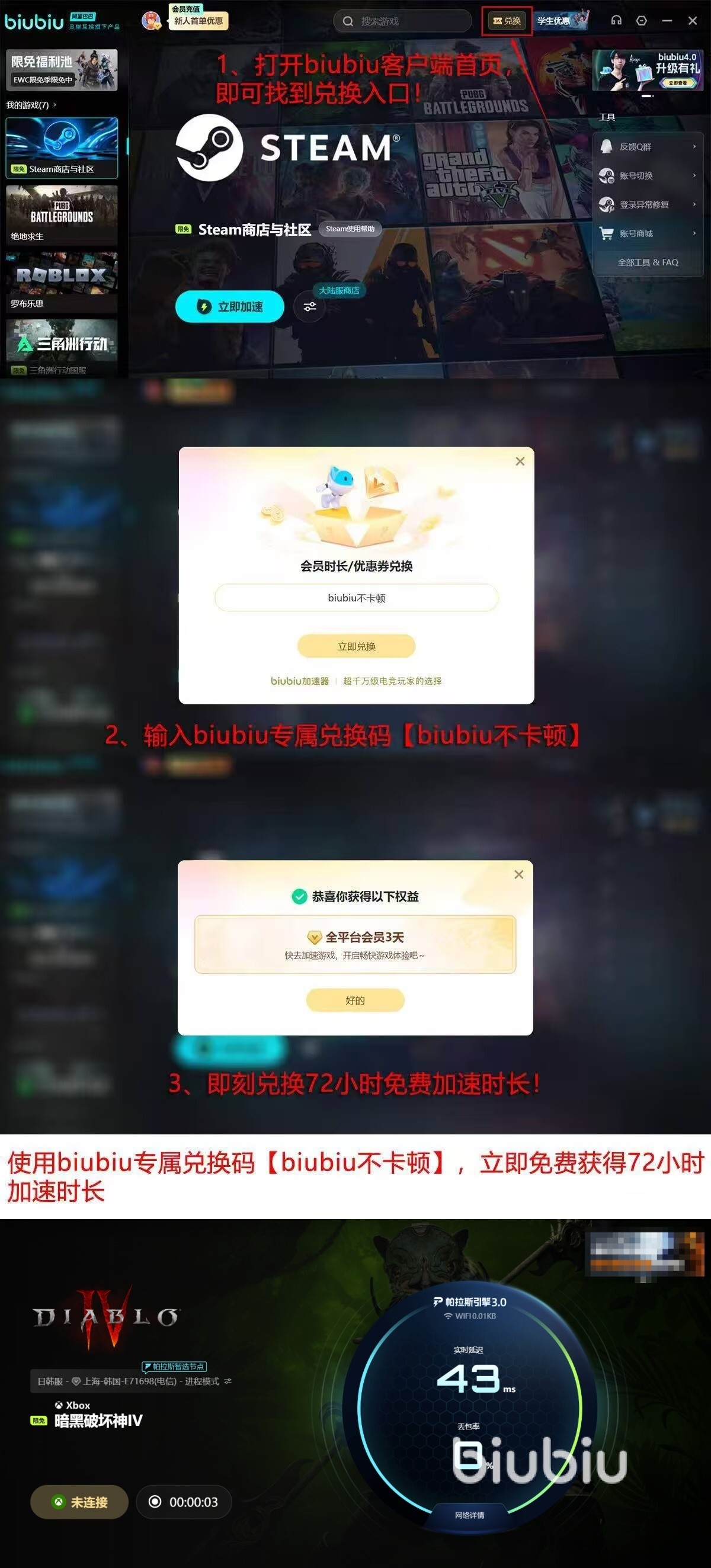 其实对于biubiu这款加速工具,很多伙伴并不是那么陌生,为了感谢大家一直以来的支持和认可,平台给大家准备了两项丰厚的福利,对于新人的首次登录和注册就可以拿到24个小时的免费畅享时间,了解biubiu的各项操作和性能。而平台的所有用户,在兑换界面通过【biubiu不卡顿】就能继续获取到三天会员免费加速权限,四天时间可以给任意游戏提供加速服务。这里小编在提醒一下,兑换口令的字母都是小写的,所以兑换的时候一定要多注意下哦。