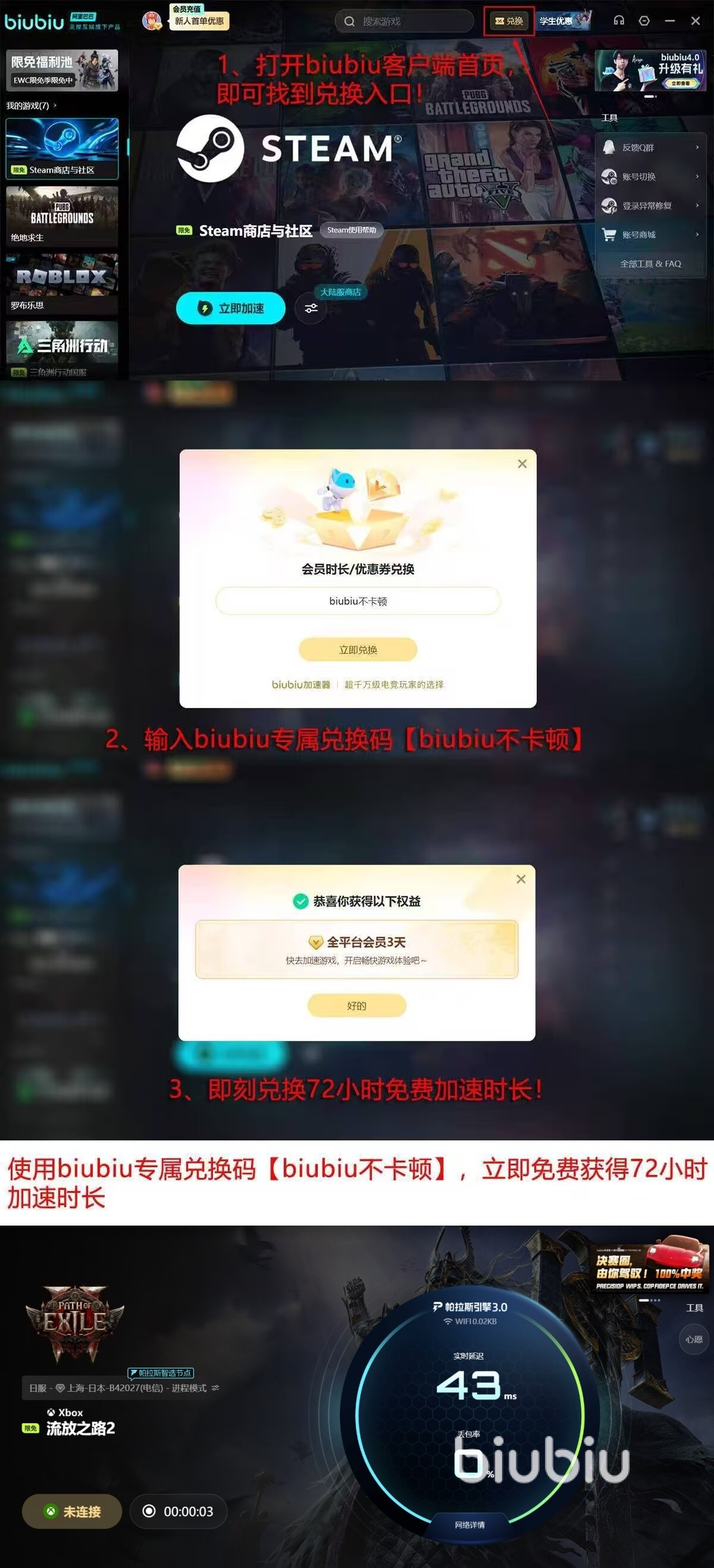 更让大家惊喜的是biubiu还为伙伴们准备了十足的福利活动,新用户的第一次注册就能免费拿到二十四个小时加速时长,不需要任何付费就能体验biubiu的性能和服务。另外平台的所有用户,在兑换界面输入【biubiu不卡顿】还能成功的兑换到72小时免费加速权益。这两个福利叠加到一起就是96个小时,充分满足大家开荒,组队刷图等多样化需求,真正做到零门槛无风险体验。