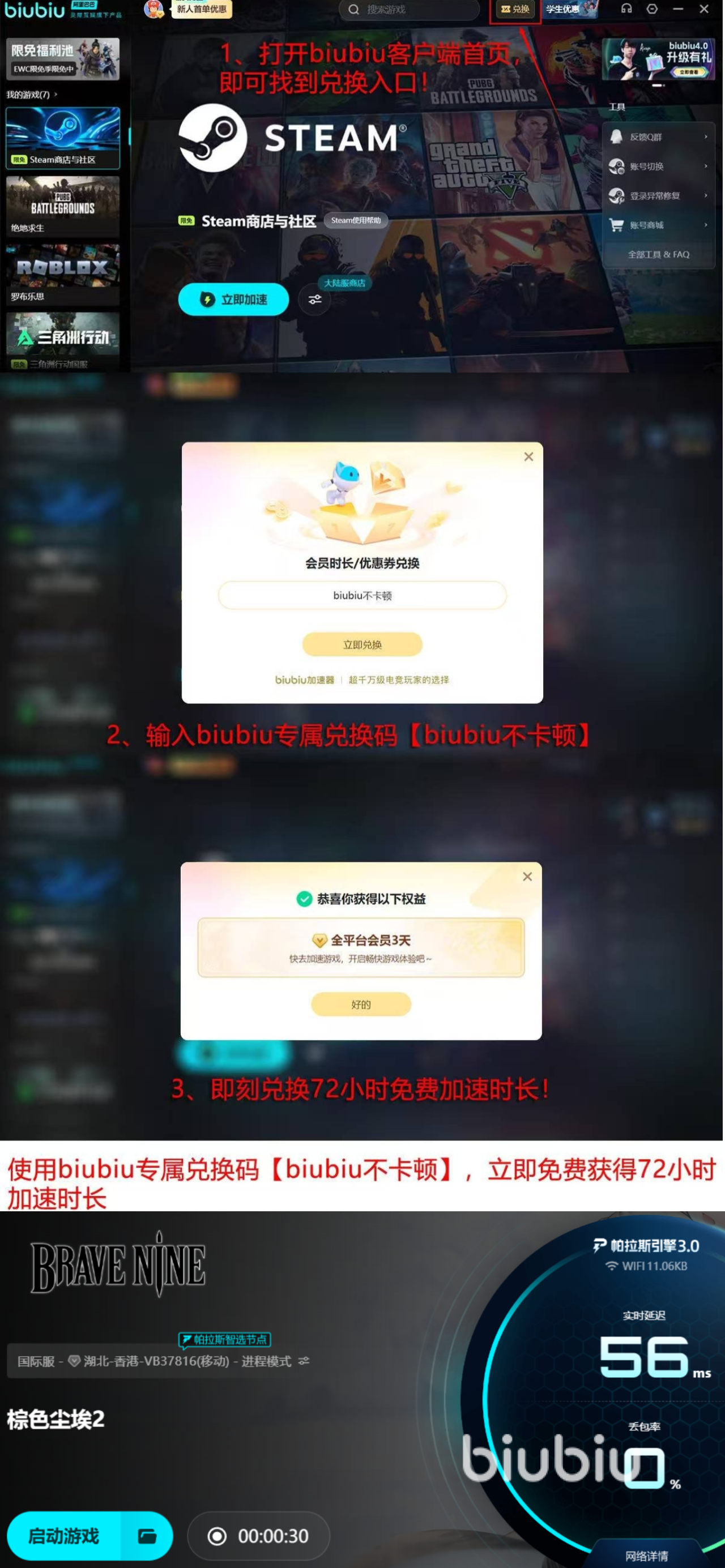 平台还给初次使用的用户提供了不少的福利,比如新人有一整天的免费提速服务,平台自动发放,无需小伙伴们领取,在初次登录注册时就可以直接享受福利了。同时若是大家觉得体验市场不够,平台还给所有人都提供了三天的体验时间,这个福利是小伙伴们自行兑换的,能够根据个人休息时间去进行领取,在指定区域内通过【biubiu不卡顿】拿到手就可以了。
