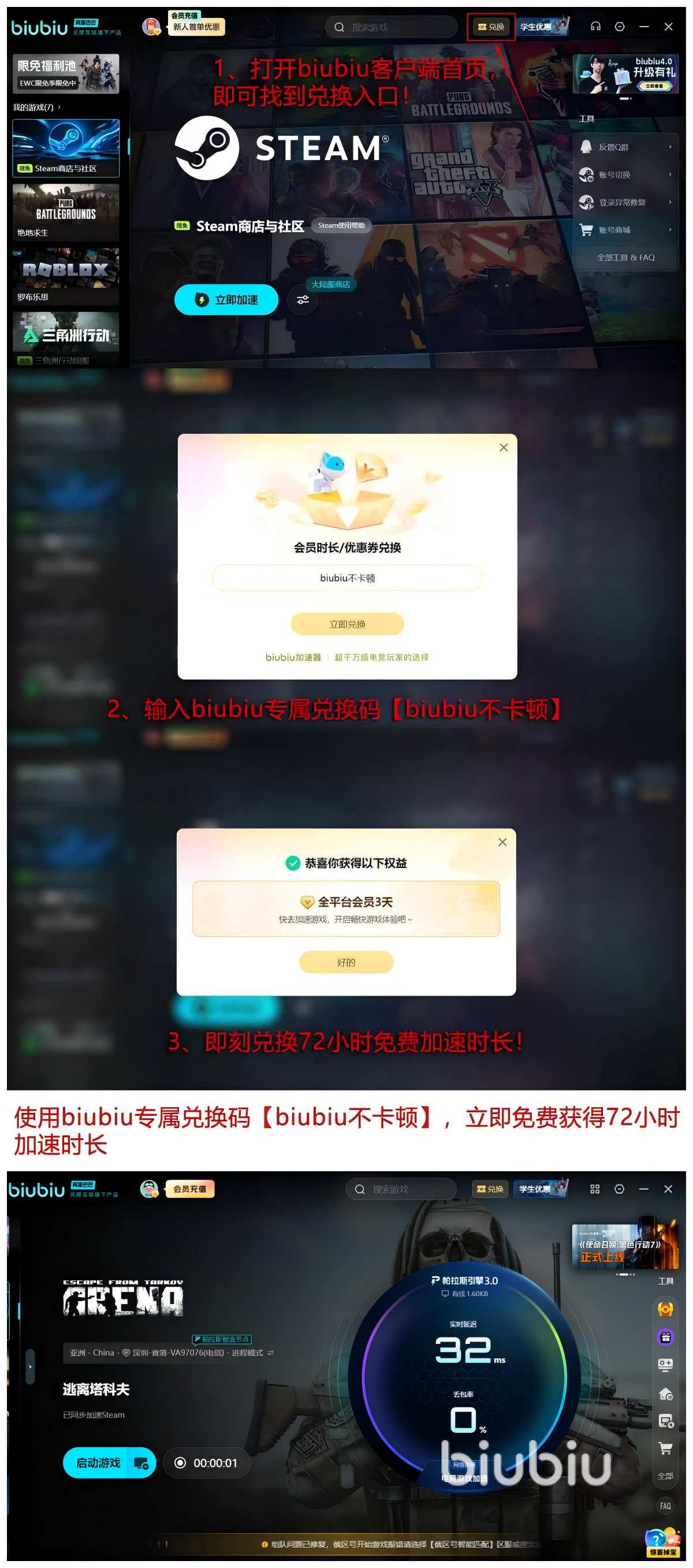 【biubiu不卡顿】的口令兑换72h免费时间,累计新用户的24h,总计获取96h。这些时间对于很多玩家来说是一次感受biubiu加速度效果的机会,在加速的时候能够快速的增加游戏稳定性,在和其他服务器的玩家联机的时候几乎没有卡顿的发生。