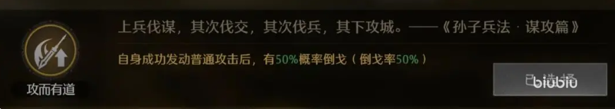 在兵法搭配方面,关羽适合选择【攻而有道】与【奋鼓】。前者可在普攻命中时以50%概率触发倒戈效果,实现反伤压制;后者则随机提升一名己方单位2%的伤害输出,若增益作用于关羽自身,则能进一步拉高整体输出峰值。