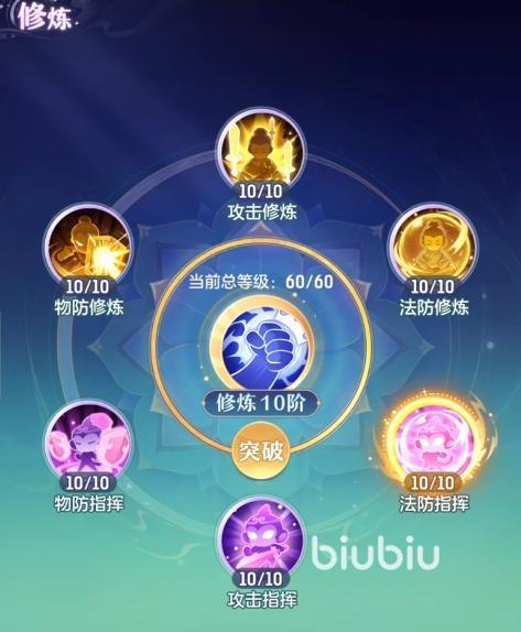 修炼系统主要用于提升角色的基础战斗能力,主要影响对象为仙友与仙灵两大单位。整个系统共设10个等级,包含六大分支:攻击修炼、攻击指挥、物防修炼、物防指挥、法防修炼、法防指挥,以及位于中心位置的斗法修炼,每一项都对应不同的属性增益。