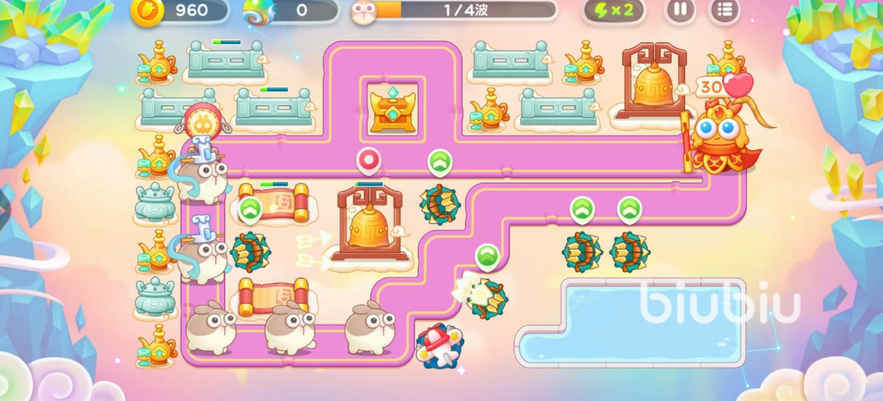 在消灭首轮兔子后,应立即部署瓶子炮来集中攻击大钟和酒壶等道具。瓶子炮对酒壶具有良好的破坏效率,随着更多炮台的布置,配合已有的2级多重箭,可逐步清空宝箱、香炉及酒壶等目标。此时可将毒箭类防御塔升至3级以增强输出能力。当地图上所有可破坏道具被清除后,合体星君便会正式登场。