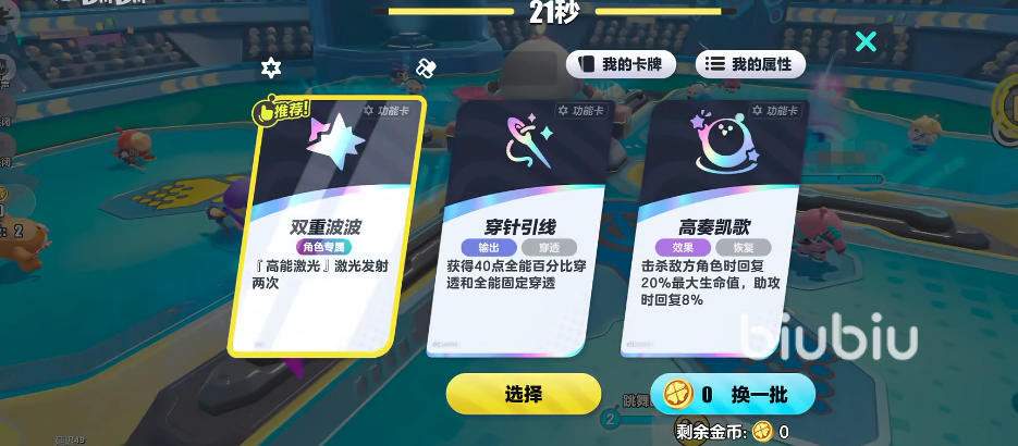 角色升级后战斗力显著提升。在每回合准备阶段,玩家还可消耗金币刷新卡牌池,以获取更优配置。卡牌分为属性类与功能类两种,最高品质的技能卡能极大增强作战能力。每轮需从三张备选卡牌中选择一张装配,因此所选卡牌是否契合自身蛋仔的技能机制,成为影响战局的重要因素。优先选择能够强化团队整体实力的卡牌,才能在高强度对抗中占据上风。