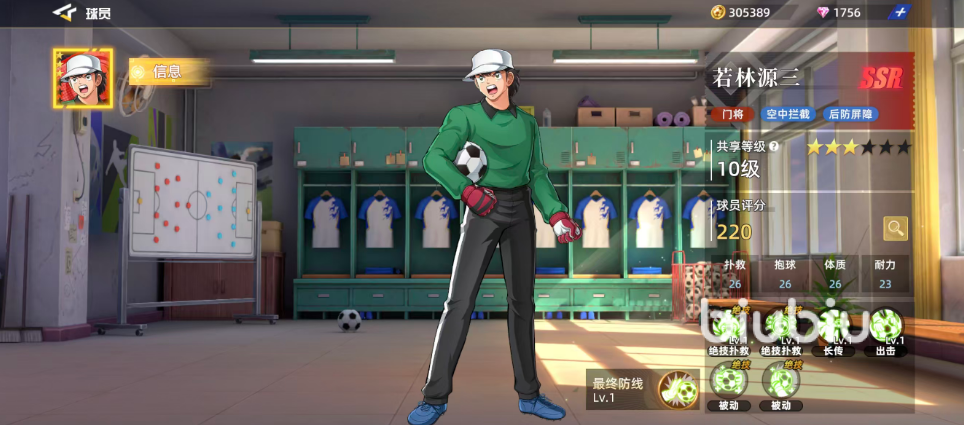 在技能配置方面,若林源三拥有两个核心扑救类主动技。首先是“荣耀之握”,当对手进行射门时可触发一次威力为115.6%扑救属性的扑救动作;若射门来自禁区外,则技能威力额外提升9.5%,特别适合应对远距离攻门,在关键时刻守住球门底线。