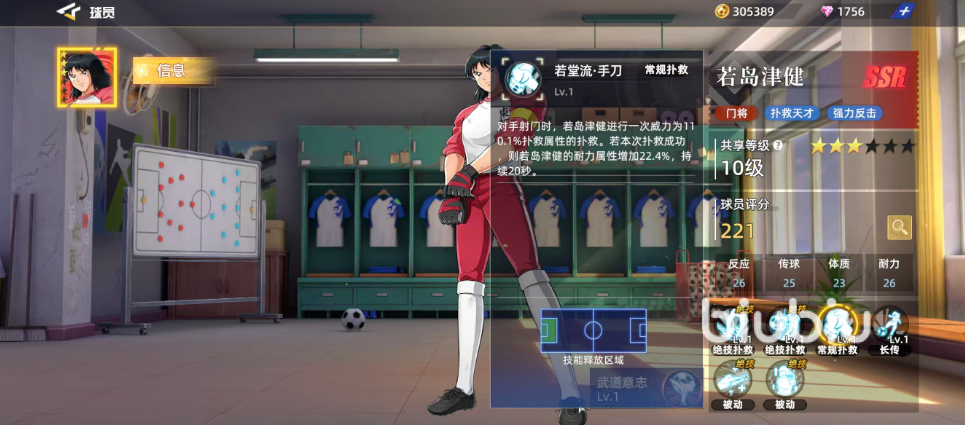 在技能机制方面,若岛津健拥有多个专属扑救技。其中,“若堂流·空翻”可在对方射门时发动一次威力相当于155.6%扑救属性的高阶扑救动作;若射门来自禁区内,则该技能威力额外提升9.5%,显著增强近距离防守效率。“若堂流·蹬跳”则专门用于应对对手抢点头球攻门的情况,触发时进行一次115.6%反应属性的扑救,当自身体力低于50%时,反应属性还能额外增加25.3%,逆境下的表现尤为突出。