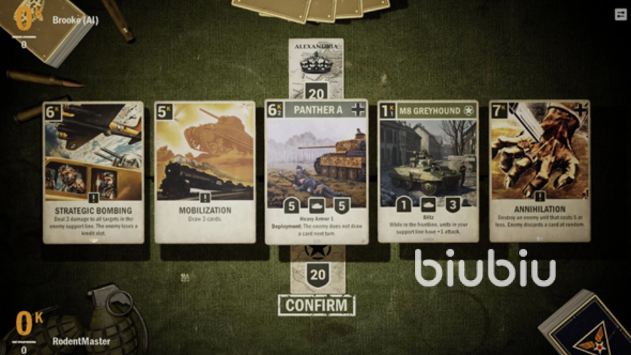 这是一款融合了传统集换式卡牌类型游戏,将二战军事题材作为游戏的主要背景故事,独创的 前线机制是游戏最大的特色,伙伴们将要在己方和地方前线来部署单位,通过攻防的转换方式来掌控战场的节奏,闪电快速突袭和稳定反击策略都是根据自己的情况纸自行选择的。但是不管怎么部署,都是要精打细算的使用有限的指挥点,可以看出是非常考验大的临场反应和战略规划的。