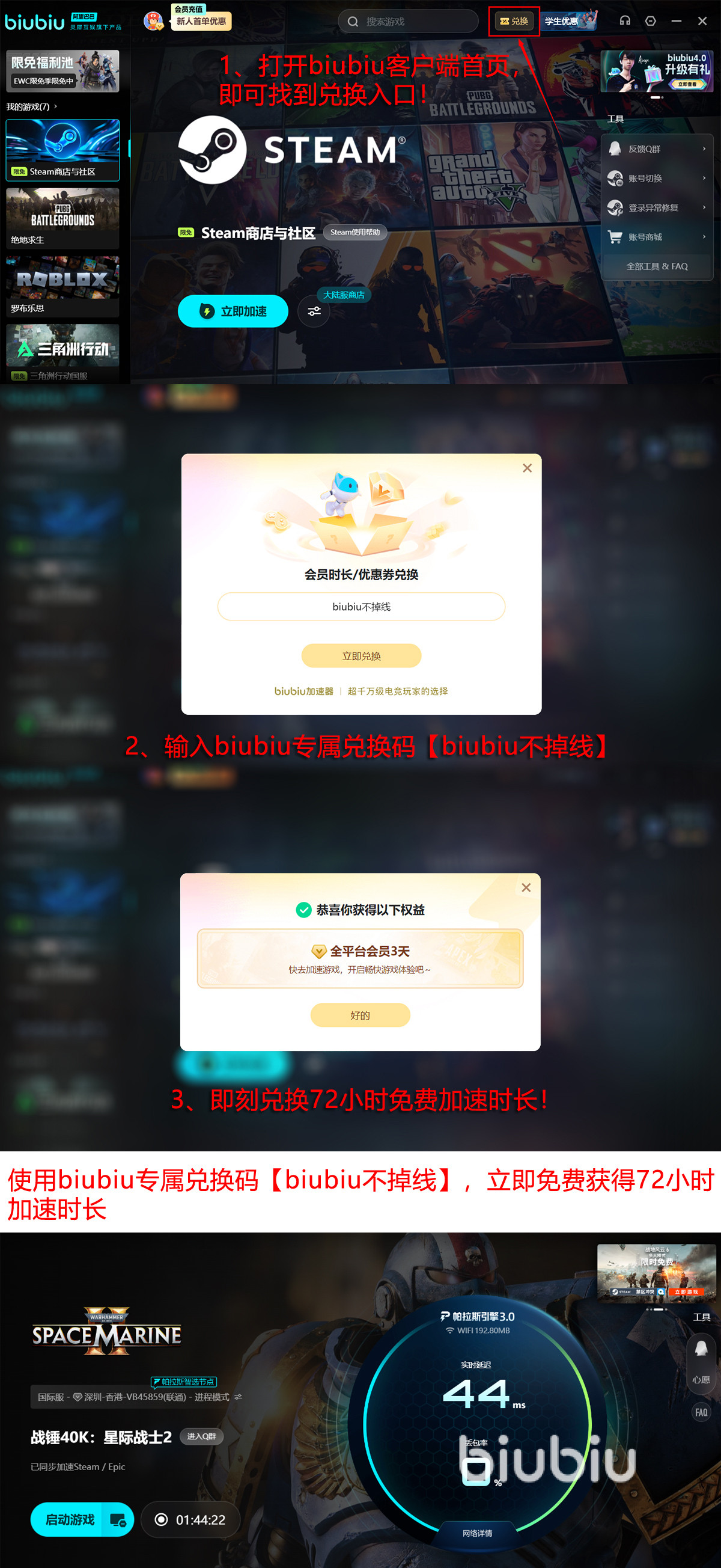 而且biubiu一直都很慷慨的,实惠也是给到了每一个用户。只要现在输入密钥【biubiu不掉线】,立即获赠72小时(三天)的超长VIP权益,要是首次注册,那系统还会额外再给你充入24小时,领取后自动叠加到96小时(四天)。