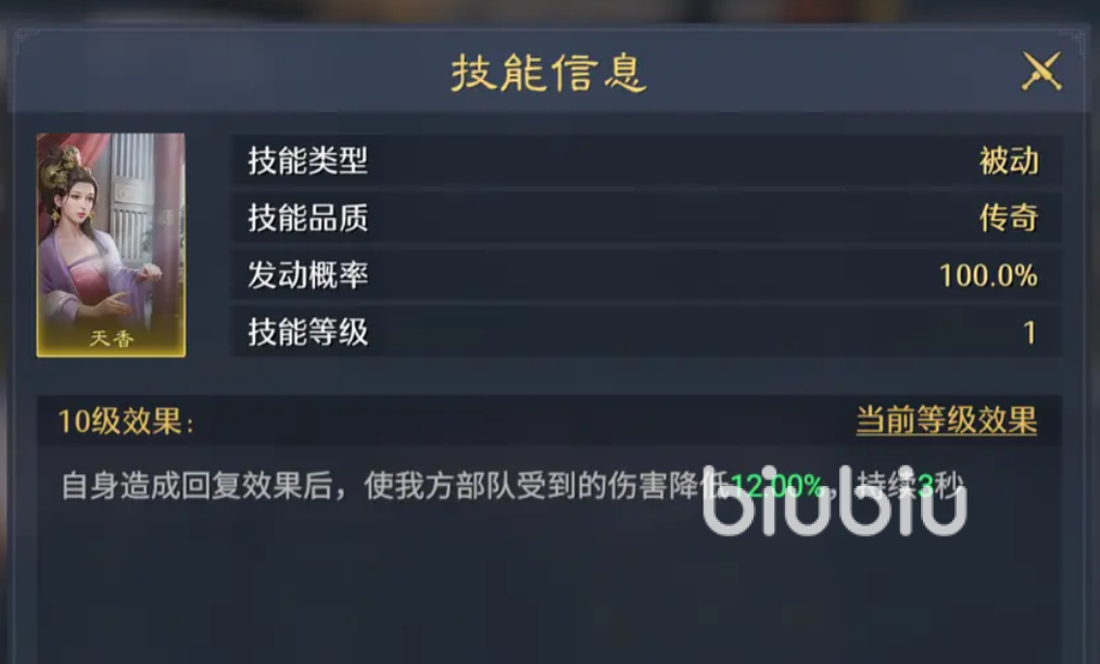 该技能与可装配战法“天香”具备极佳的联动性。“天香”可在刘备施加治疗效果后,使我方全体降低12%所受伤害,持续3秒。由于“德安天下”可频繁触发回复,因此能反复激活“天香”,从而实现长时间覆盖的减伤增益,显著提升全队坦度。