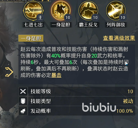 赵云的核心技能名为“一身是胆”,该技能通过普通攻击触发效果,每次普攻可为自身提升20点武力值。随着战斗进行,当被动叠加至满层时,有40%概率额外提升统率属性。这一机制使他在持续作战中越战越强。此外,其主动技能具备连续多段伤害,并在接下来的3秒内为全军提供50%的移速加成,极大增强了部队的机动性与追击能力。若进一步配合“七进七出”类增益技能,还能实现更高频率的被动触发,形成强力循环。