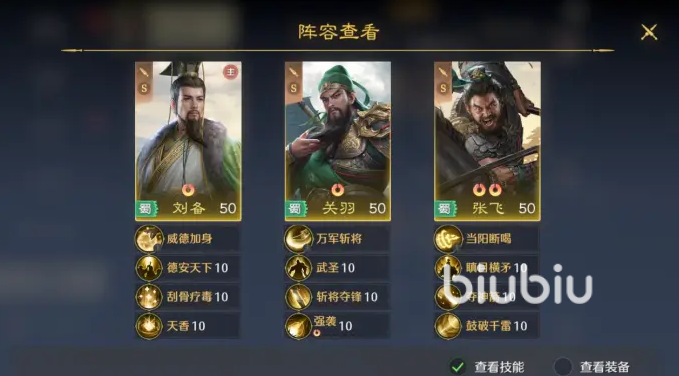 若玩家愿意投入少量资源,桃园三兄弟组合是一个值得考虑的选择。该阵容沿用经典枪兵体系,具备良好的成长性,既能快速推进前期进度,也能平稳过渡至中后期。刘备作为主将,拥有全面的怒气技能机制,集治疗、增伤与减伤于一体,并支持跨队支援治疗,极大提升了开荒期的容错率。推荐为其搭配刮骨疗毒与天香,进一步强化生存保障;若缺乏上述战法,也可选用仁治武功或资军后勤作为替代方案。