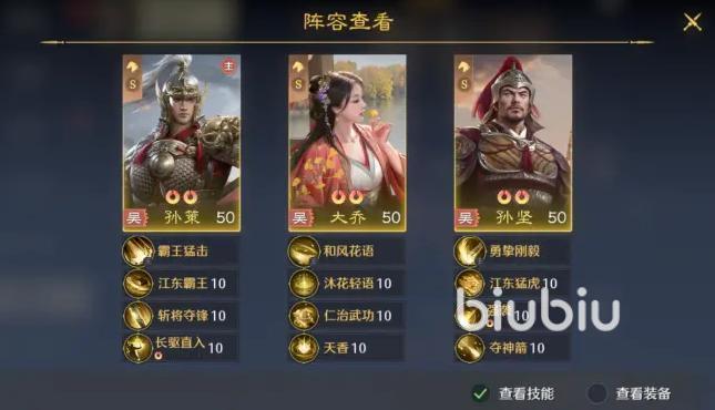 大乔作为队伍中的治疗核心,推荐携带仁治武功与天香两个辅助类战法,分别提供治疗与减伤效果,保障团队生存能力。若尚未抽到高品质战法,可用资军后勤、戌脉等紫色治疗技能临时替代,足以维持基本续航需求。孙坚位于3号位,主要承担收尾输出与控制职能,其固有技能有一定概率使处于威压状态的敌人陷入眩晕,有效打断敌方节奏。因此应优先为其配备高爆发战法,例如强袭、夺神箭等,若资源不足,龙骧、锯齿猎箭也是不错的紫色选项。