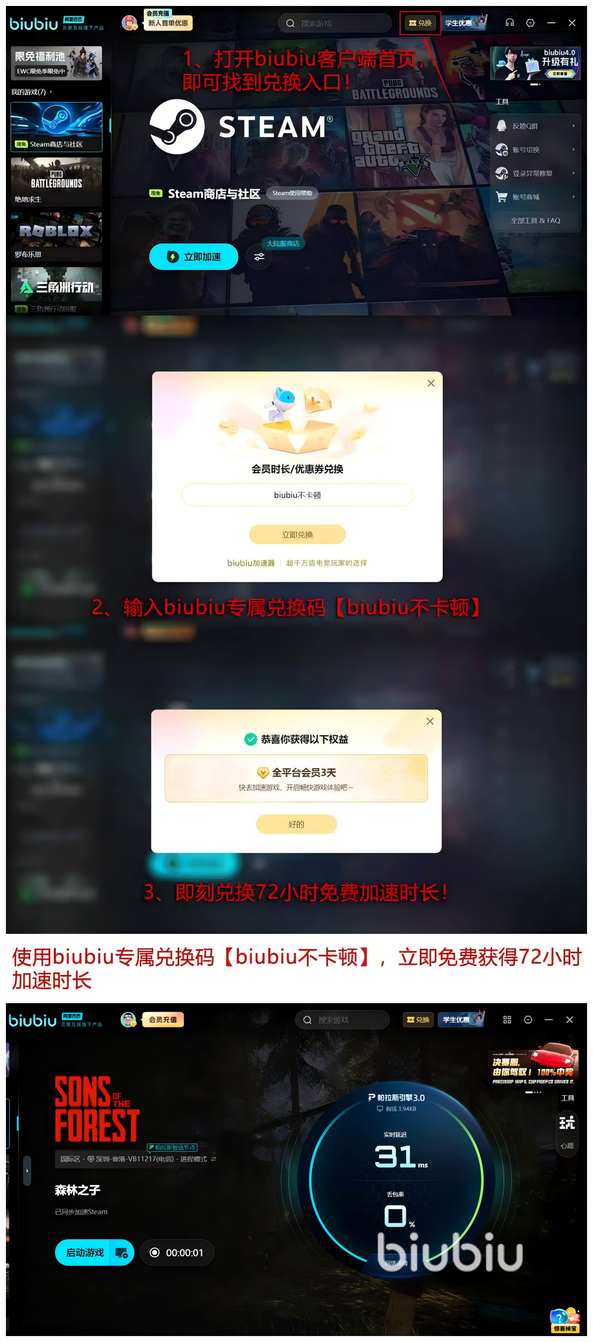 【biubiu不卡顿口令】输入后可领取72小时免费加速时长,新用户还可叠加24小时试用时间,总计享受72小时畅快加速体验。无论是短期体验还是长期使用,都能明显感受到网络质量的改善,助力玩家沉浸于高质量的游戏环境中。