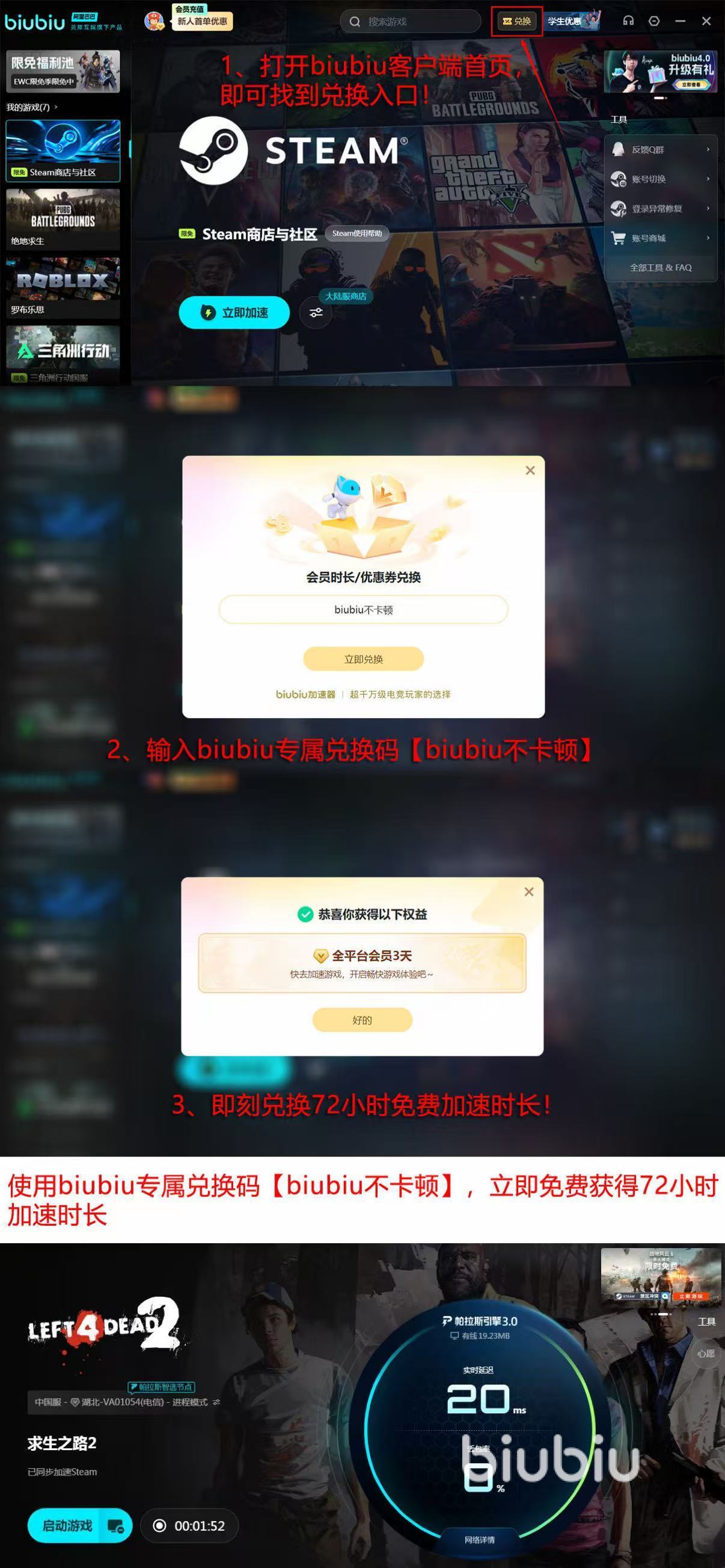 目前正是体验biubiu加速器的理想时机,新注册用户即可享受24小时免费加速服务,畅玩国内外热门游戏无压力。同时,平台面向所有新老用户发放3天免费加速福利,输入兑换码【biubiu不卡顿】即可领取。除此之外,biubiu还推出学生专属优惠、限时免流游戏池、惊喜掉落奖励等多种活动,让用户以更低成本享受高质量的游戏加速服务。
