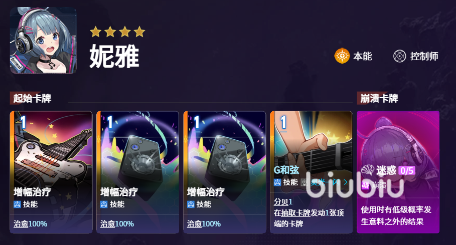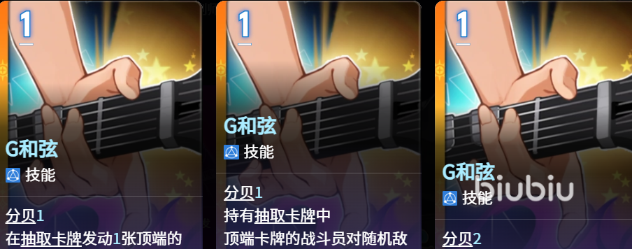 妮雅则承担全队增益中枢职能。其技能“增幅治疗”具备显著覆盖率优势,且与唯一主动技深度耦合。当触发“灵光一闪”时,“重音闷音”卡牌可弃置费用最高手牌,并使持有者对随机敌方造成150%额外伤害——该效果将辅助的随机性转化为可控爆发点。基础卡组中,“G和弦”作为起手抽卡手段,稳定补充手牌池;而专属卡牌“妮雅的好奇心”,可在抽牌阶段检视顶部3张卡,任选1张弃置并刷新,大幅提升优质卡牌获取效率,尤其适配需高频触发“崩溃”类卡牌的中后期节奏。