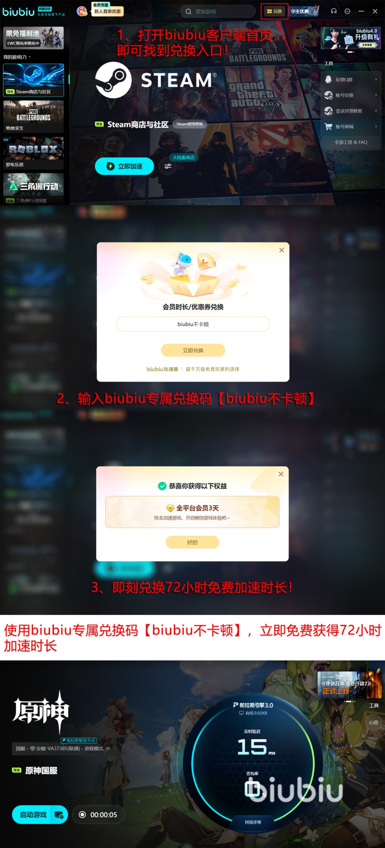 对于尚未尝试过此类工具的玩家,现在可通过注册新账号领取24小时免费加速时长,同时新老用户均可输入【biubiu不卡顿】兑换码额外获得3天服务时间,实现先试用后决定。目前平台对新用户的福利支持力度较大,双重奖励叠加最高可达96小时免费体验。