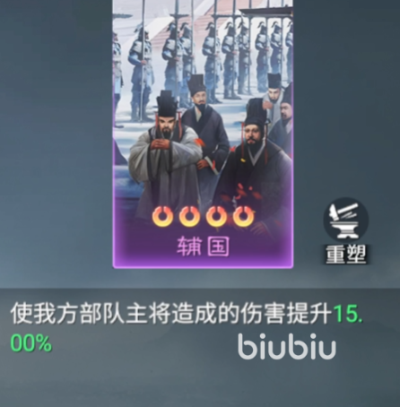 “辅国”技能卡在前期可能被低估,但实际上其潜力不容忽视。该技能可为主将带来15%的伤害增益,适用于各类物理或法术输出型主将。由于增益直接作用于主将,因此在组建以主C为核心的阵容时效果尤为突出,能让强势武将在前期更快建立压制优势。