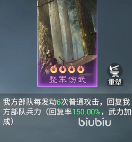 第二款值得推荐的是“整军伤武”。该技能机制围绕普攻次数触发,每当部队累计完成6次普通攻击后,即可激活一次兵力恢复效果,回复率高达当前兵力数值的150%,对于持续作战能力要求较高的阵容来说,这一技能能显著增强续航能力,尤其适合高频出手型武将搭配使用。
