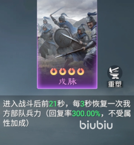 最后介绍的是“戌脉”,这是一张侧重战斗中期恢复能力的技能卡。在战斗进行至第21秒后自动激活,之后每3秒为我方武将恢复相当于部队兵力300%的血量,且该恢复效果不受其他属性加成影响,确保了稳定的治疗量。尽管不具备额外增益叠加机制,但其高额回复率在持久战中仍具较强生存保障作用。
