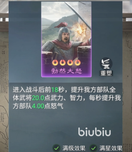 首推技能为“勃然大怒”:该技能可在战斗开始后的前18秒内,为我方全体部队成员提供20点物理攻击加成与20点智力属性提升,同时每场战斗还能额外积累4点木器值,有效加快怒气技能的释放节奏,使主力输出能够更早释放关键大招,在前期对战中掌握主动权。