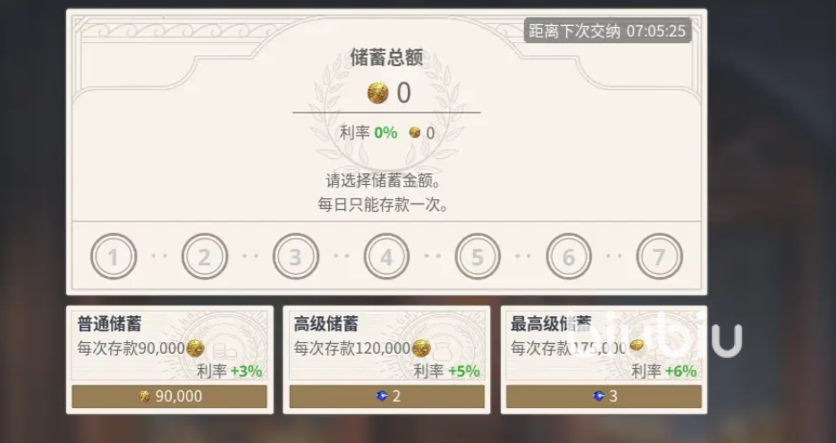 除了主动赚取外,科学管理现有资产同样重要。进入“银行”可享受三项服务:一是存款功能,用于安全存放闲置达克特,防止因海战失败导致损失;二是储蓄计划,设定为期7天的周期,每日存入固定金额,到期后返还本金并附带利息;三是定额保障服务,可在遭遇意外情况时申请相应赔偿,提升抗风险能力。
