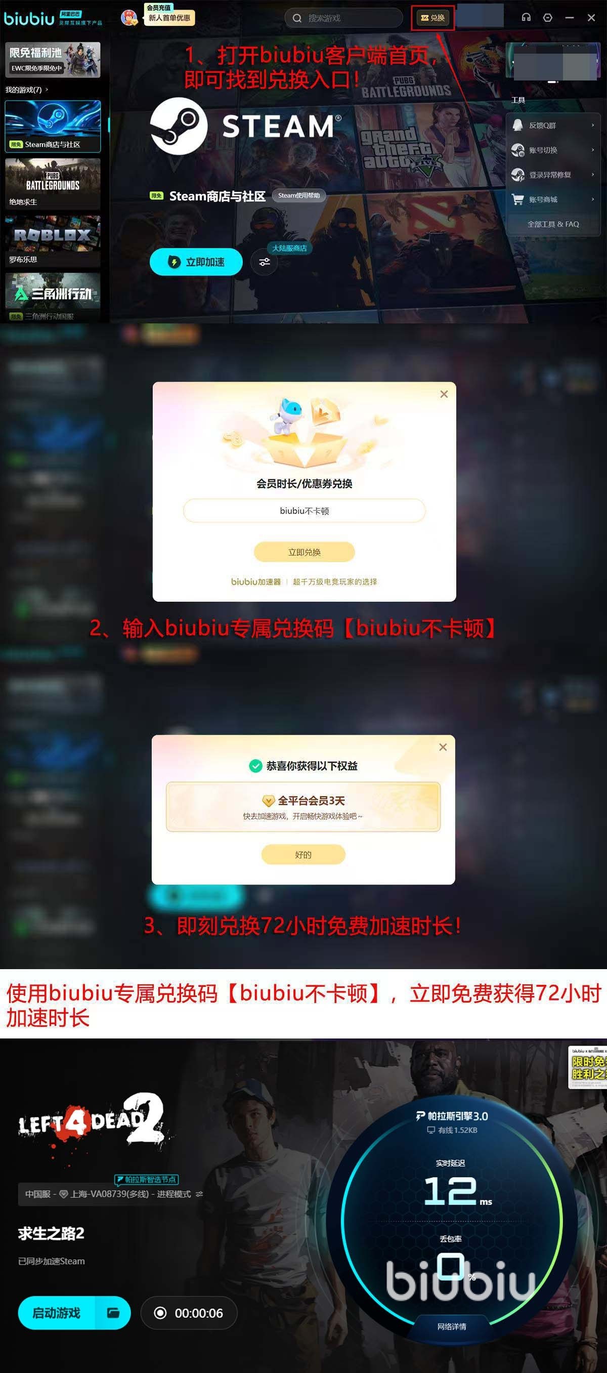 在加速支持下,网络得到大幅稳定,操作感和体验感也有飞速提升,只是大家一定担心效果如何?正好,biubiu现在有非常多场的免费时间可以领取,只要注册成会员,系统会立刻给24小时免费体验时间,如果还不够,则可以复制【biubiu不卡顿】的口令,来到客户端上,在兑换窗口上则能直接兑换到72小时福利时间,这个老会员能使用一次,总体上,通过这两个活动,在成功注册会员后能累积达到96小时免费时长。