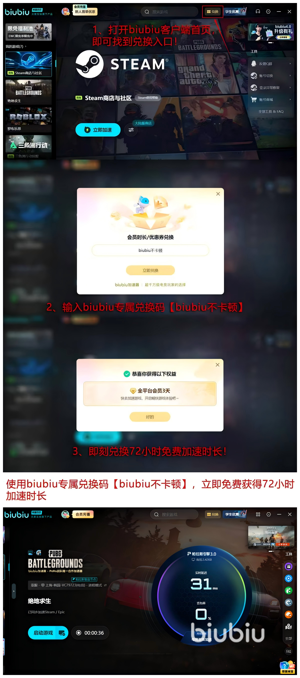 【biubiu不卡顿】暗号绝对不能忘记,按照下面的方法输入就能立刻领取72小时时间,新用户24小时游戏时间可以累计,也就是说总计获取96个小时的游戏时间,对于玩家来说可以说是黄金体验时间,能让很多玩家从菜鸟用到新手阶段,保证各位喜欢上用该加速器游玩游戏,增加游戏的体验。