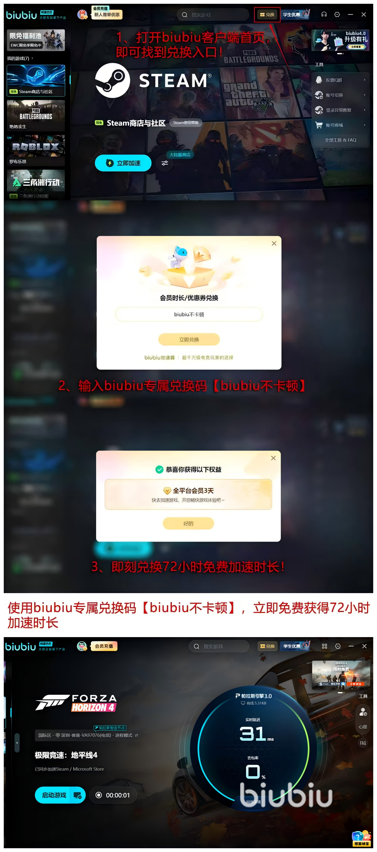 比如大家输入【biubiu不卡顿】的口令,该口令输入就能获取72小时游戏时间,新人获取的24小时叠加总计96小时,为各位玩家获取超级多的游戏时间,对于不想花钱体验加速器的玩家,这是一次非常好的福利,能让各位想体验再做决定,绝对不盲目选择biubiu,多数体验过的玩家都会选择成为长期的会员,毕竟口碑和实力摆在玩家的面前,真的能显著降低ping值和提升网路的加速度。