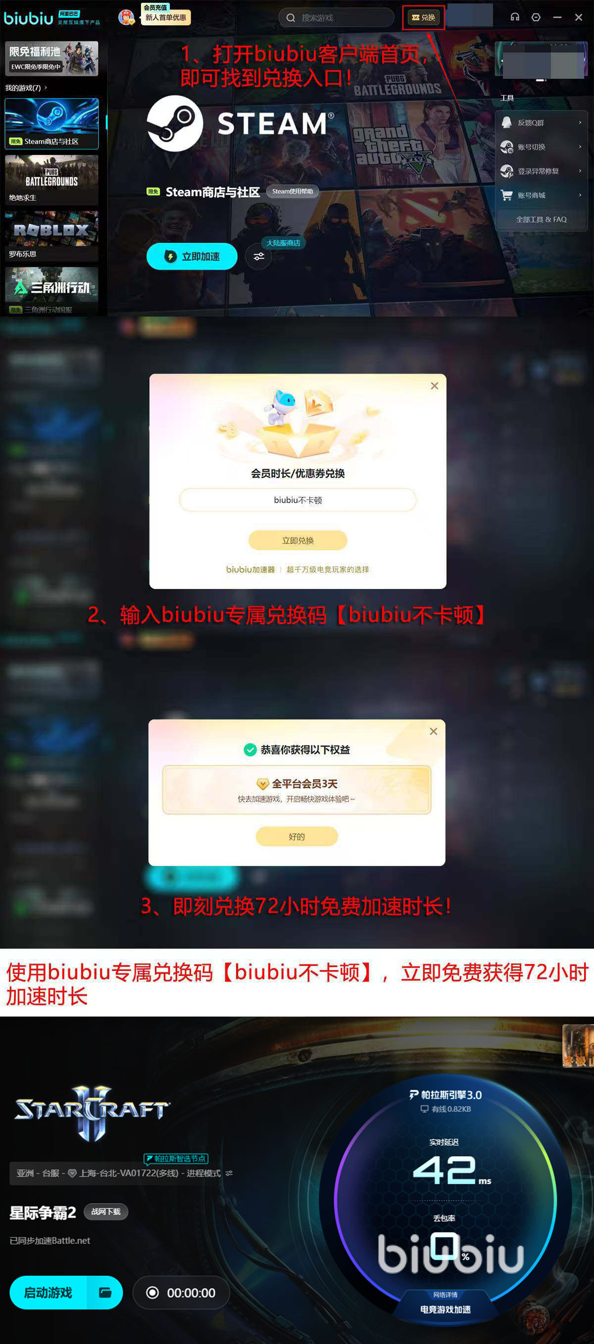 在经过biubiu优化后的网络速度之后,大家在玩星际争霸2时,会明显感受到操作时,鼠标或者键盘的点击响应会更快,对线时操控会更丝滑。当然,说再多不如一试,正好现在有免费时间可以领取,只需要花上几十秒时间,注册成为会员账号,成功注册就有24小时免费时间领取,成为会员后还能参与【biubiu不卡顿】口令兑换72小时福利活动,两者活动叠加后能有96小时,而且有数千款游戏免费加速。