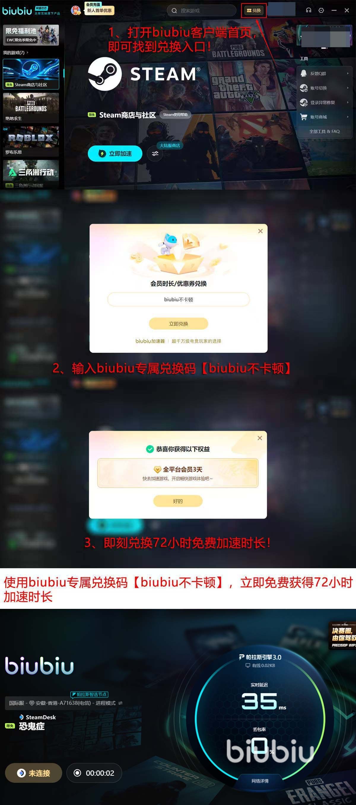 优化后的游戏,其游戏的操控性和对操作的灵敏反应能力都得到了大幅提升,可以保证在游戏过程中的流畅程度,当然,大家一定想知道是否真的能做到,这里官方给大家免费提供了多天的试玩体验,只要注册就送,成功注册立送24小时免费时间,成为会员后,参加会员口令活动,用【biubiu不卡顿】在首页上还能再得到72小时,老会员也能参与一次该活动,而新会员实际得到的时间是96小时。