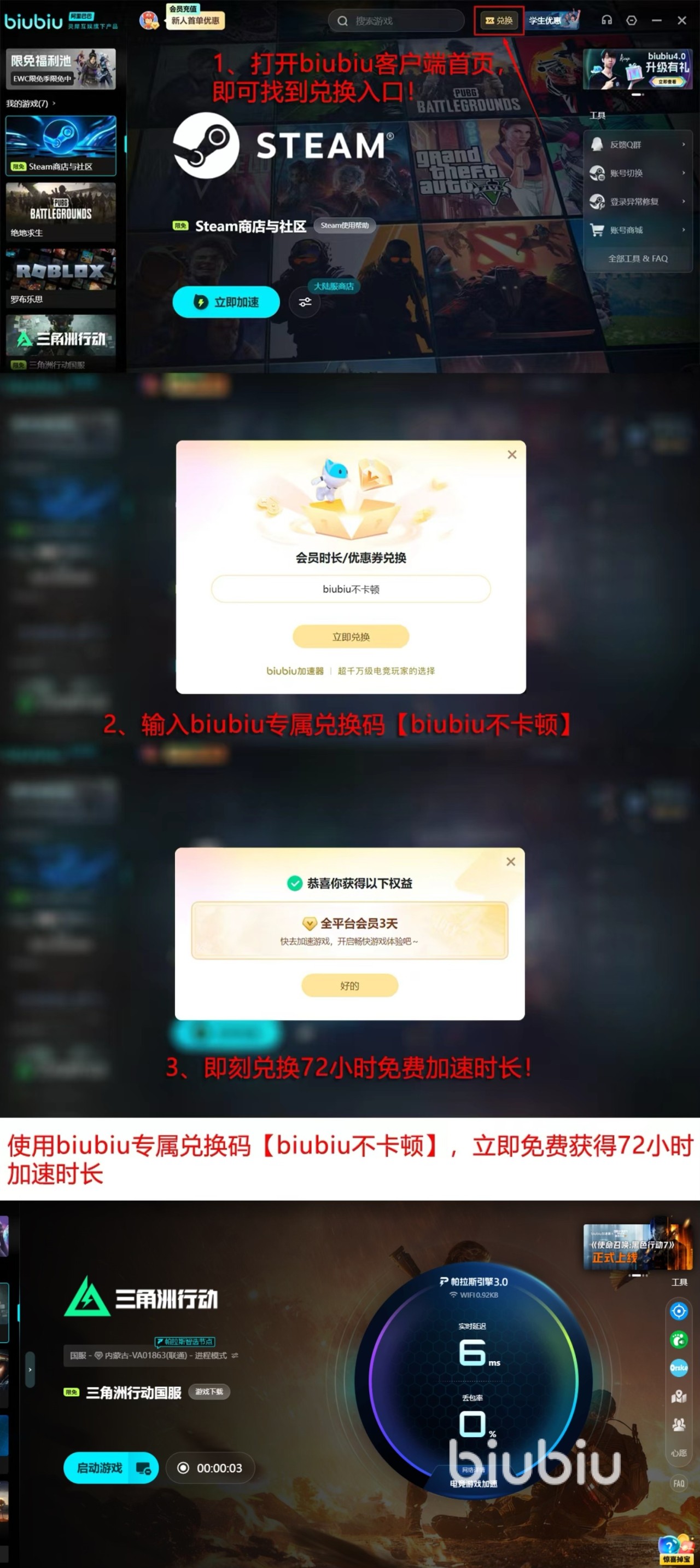 除了技术层面的提升,biubiu加速器也为新注册用户提供贴心福利,赠送长达24小时的免费加速时长,注册即享无需等待。此外,官方还发放了一批兑换码【biubiu不卡顿】,所有用户均可凭此码领取三天加速服务,充分体验各项核心功能。