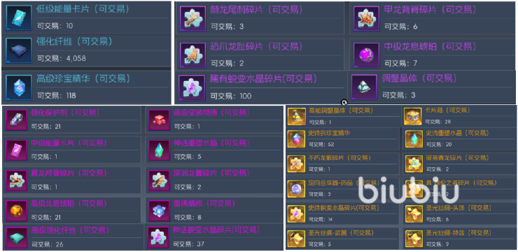 游戏中开放交易的道具按稀有度划分为四档:普通、稀有、神话、史诗。各档位对应明确的经济回报区间,直接影响单次产出效率。普通道具如强化纤维、高级珍宝精华,产出量大、价格稳定,适合作为日常保底收入来源;稀有道具如加隆背脊碎片、终极龙息琥珀,单价中等,需配合特定副本集中刷取;神话道具属高价值目标,是多数搬砖玩家的核心追求;而史诗道具如史诗珍宝精华、不朽龙骸碎片,则代表最高收益层级,单件即可覆盖整日预期产出目标。