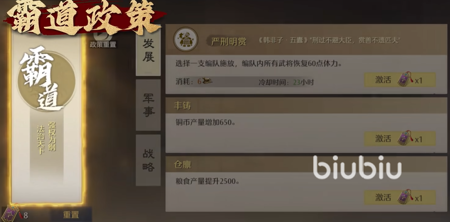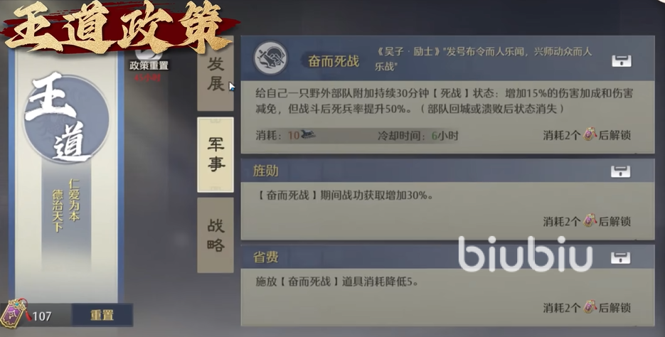 无论选择哪一政策分支,使用技能均需消耗虎符。虎符可通过探索沙盘地图中的民居或在联盟商店中兑换获得。选定发展方向后,即可逐步升级相关技能,构建专属的成长体系。