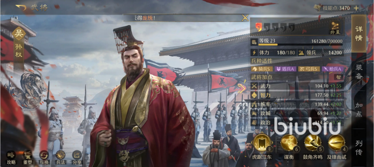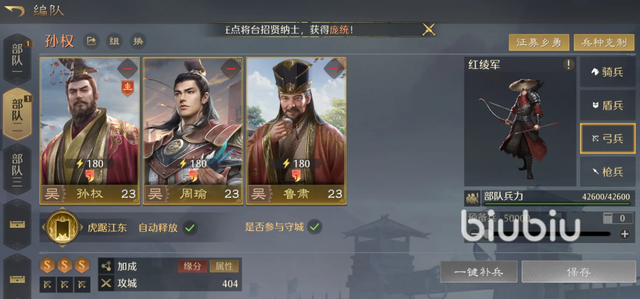 主将推荐孙权——其自带技能可同步提升全队统率、智力、武力三项基础属性,并在释放主将技时兼顾伤害输出与兵力回复效果,是整套恢复弓体系的核心枢纽,为队伍提供扎实的战力支撑与续航保障。