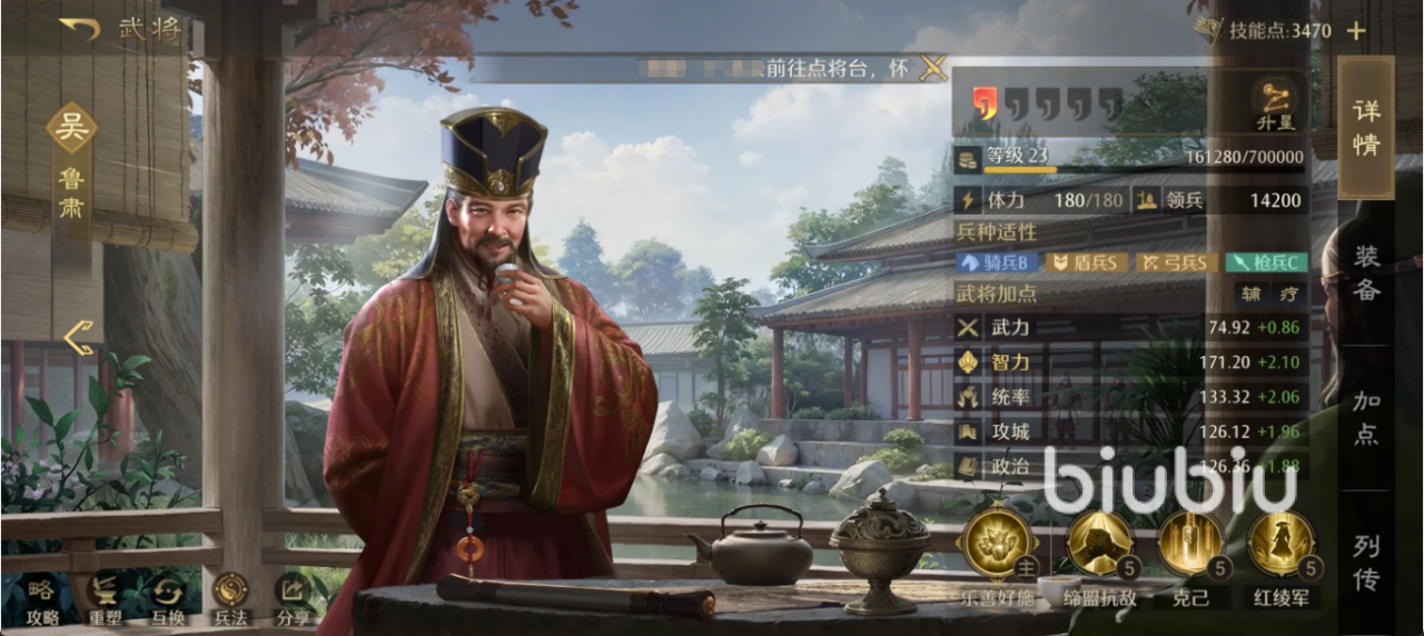 第三位武将建议选用鲁肃——专注辅助增益与治疗补充,可为全队提供统率与智力双重加成,既强化前排承伤能力,又提升整体谋略输出效率,同时填补治疗链空缺,进一步夯实队伍韧性。