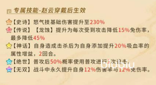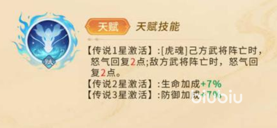 在天赋系统方面,赵云于传说1星时解锁“虎魂”效果:每当己方或敌方武将阵亡时,均可为赵云积累2点怒气,加快技能释放节奏。升至2星时,生命值增加7%,配合其高机动性与吸血机制,生存能力进一步加强。达到传说3星后,将激活防御属性加成,使其在前线作战时更加稳固,整体安全性得到质的提升。