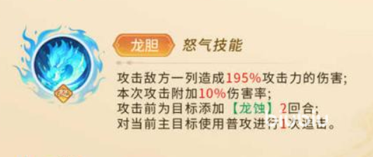 赵云的怒气技能具备强大的群体打击能力,可对一列敌人造成195%的高额伤害,并附加10%的伤害率提升,且在目标处于“龙蚀”状态时效果更佳。此外,当敌方目标进行普攻时,赵云有机会触发一次追击,进一步强化其连锁输出机制。因此,在搭配具有联动技能的队友时,赵云能够更好地发挥其多段打击的优势,形成高效的伤害循环。