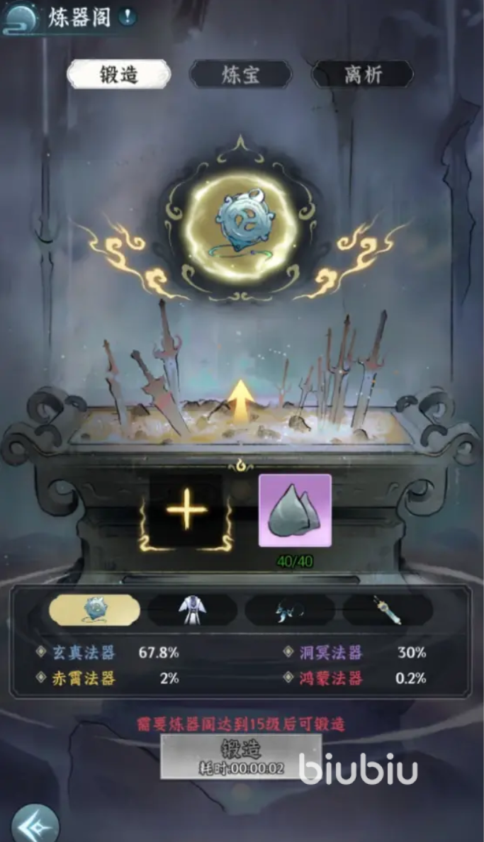 炼器阁需角色达到15级后正式解锁锻造功能。该阶段起,玩家可消耗特定材料——如鬼将领颅骨——启动单次仅需2秒的即时锻造流程,随机产出不同品质的法器。需注意:锻造本身不依赖操作技巧,结果完全由材料配比与系统概率决定,因此前期资源积累策略远比频繁点击更为关键。