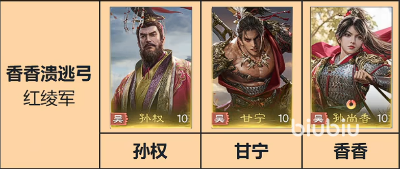 第三套阵容是以孙尚香为核心的溃逃流派,主打高频次叠加伤害与破防机制。孙尚香拥有双S级猛攻资质,伤害可叠加至最高50%×9层,且当敌方处于溃逃状态时,有概率无视防御造成真实打击,单次收益可达450。然而,孙尚香并不适合作为主将使用,因其主动技能强度有限,更适合担任副将位置。最佳搭配为甘宁,其技能不仅提升自身伤害,每次释放主动技时均会附加溃逃状态,确保孙尚香能够稳定触发特效。至于属性增益来源,孙权依旧是最优解,可通过被动为全队提供三项基础属性加成;若无孙权,也可选用其他具备增益效果的武将替代。