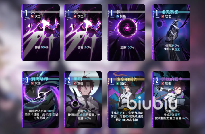 此时,凯隆的作用就显得尤为重要。他在使用攻击类卡牌时可生成“虚无”状态,并借助“灵光一闪”触发“无忧的回声”,在造成240%伤害后额外生成5张虚无卡。每拥有一层虚无,攻击力将提升40%,多层叠加后能实现显著的连击增益效果,极大增强持续输出能力。