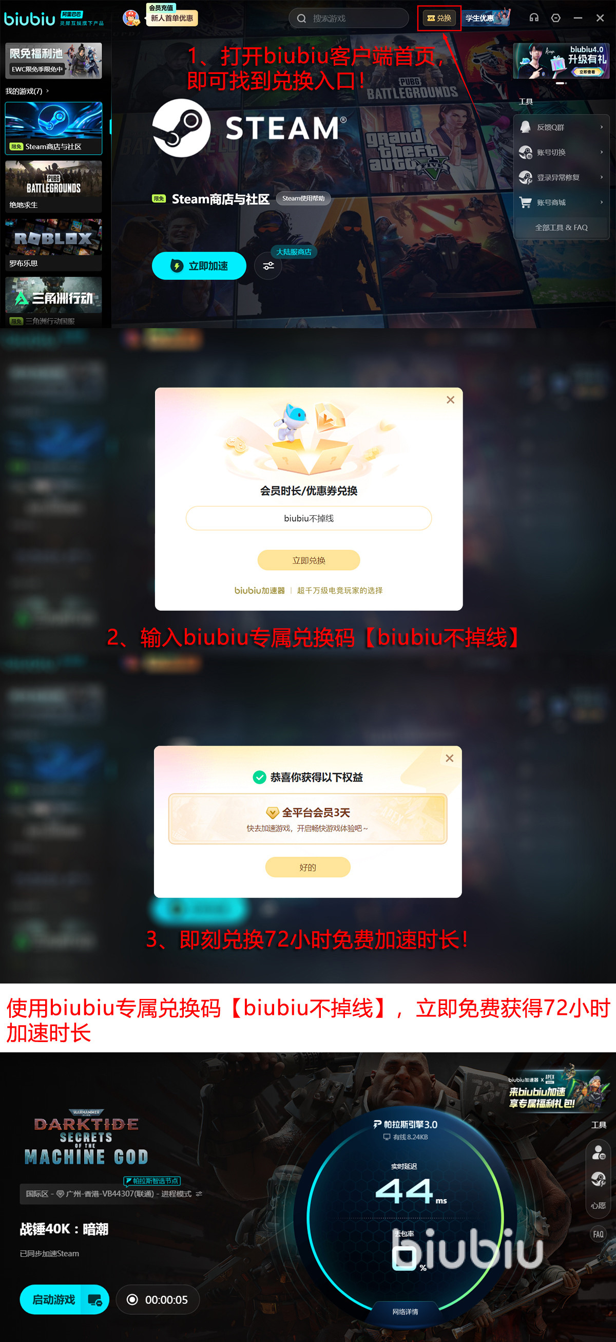 福利就在眼前,马上注册biubiu账号,新用户就有专享畅玩暗潮加速24小时,再加上一个【biubiu不掉线】口令还能继续得到强力支援72小时时间叠加,轻轻松松就让新人可以尽情玩96小时毫无顾忌的激战。