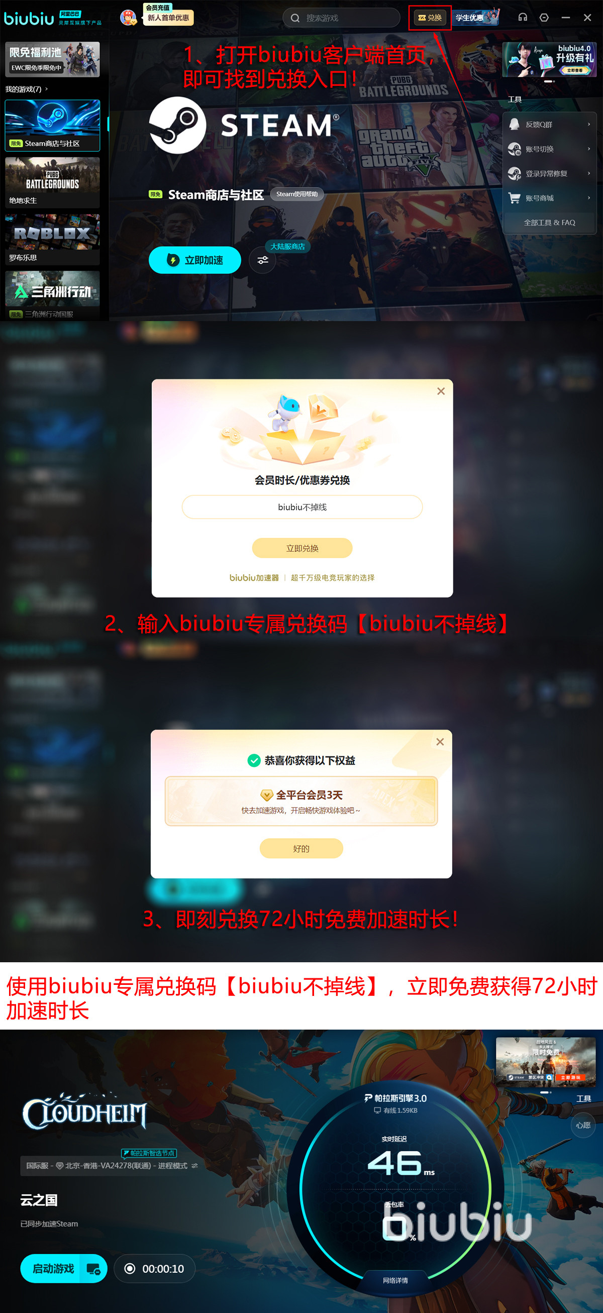 现在,所有玩家只需输入专属码【biubiu不掉线】,即可直接领取3天免费提速,第一次新注册成功更能额外获得24小时全平台会员。二者叠加,总计可享96小时加速,这不仅能当下极速下载,更能确保开服后与伙伴们能全程稳定、流畅地畅游云端世界。