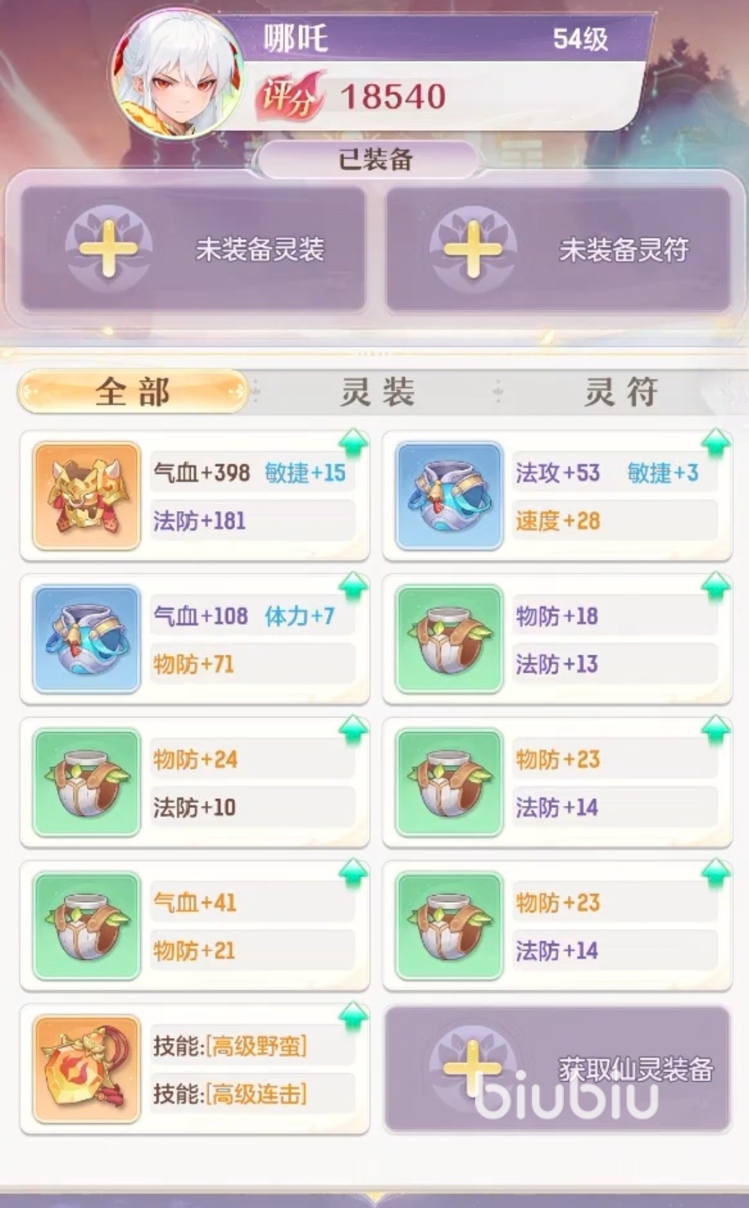 哪吒:火系法术输出代表,初始资质优于小太白,进阶后属性成长曲线更为陡峭。天赋技能【三头六臂】可释放【赤焰穿心】,并支持怒气消耗机制——每额外消耗20点怒气,即增加1次对主目标的追击;叠加范围技【风火连天】,可对前排全体敌人施加高额火伤与灼烧效果。通用技能【高级强力】与【高级野蛮】进一步强化其物理穿透与攻击频率,在中高难度副本中表现突出。