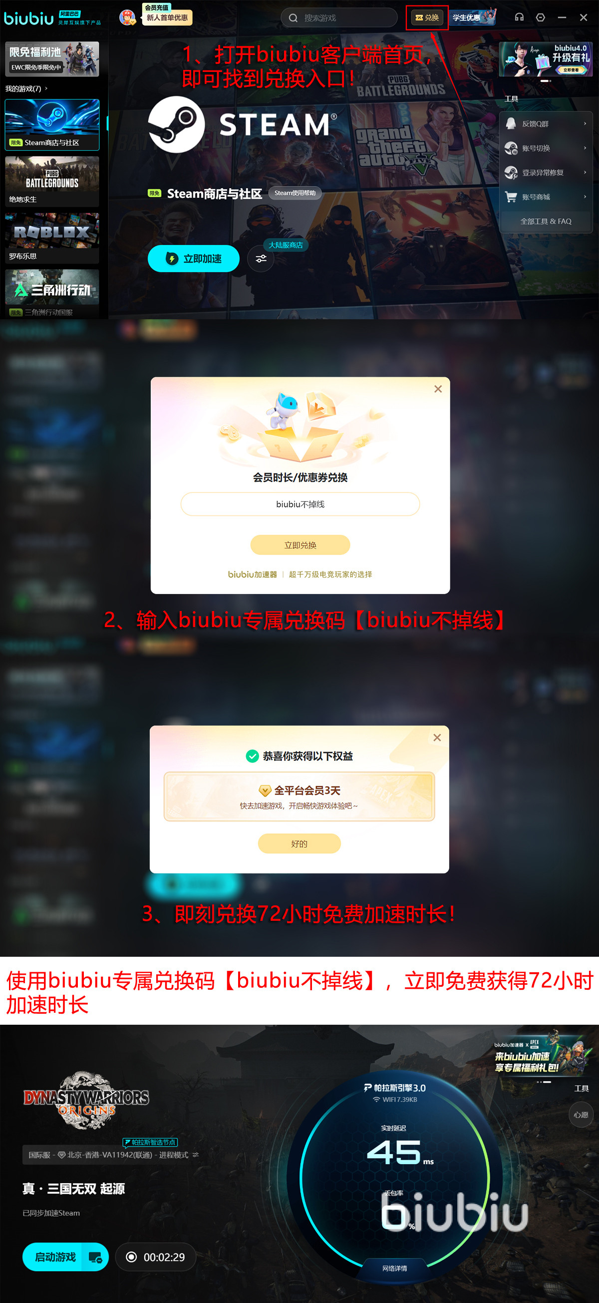 即日起新用户注册并登录,即可立即获得24小时全平台高级会员权限;所有用户均可凭【biubiu不掉线】口令额外领取3天免费加速时长;新注册用户还可叠加双重福利,最高享96小时连续加速服务。