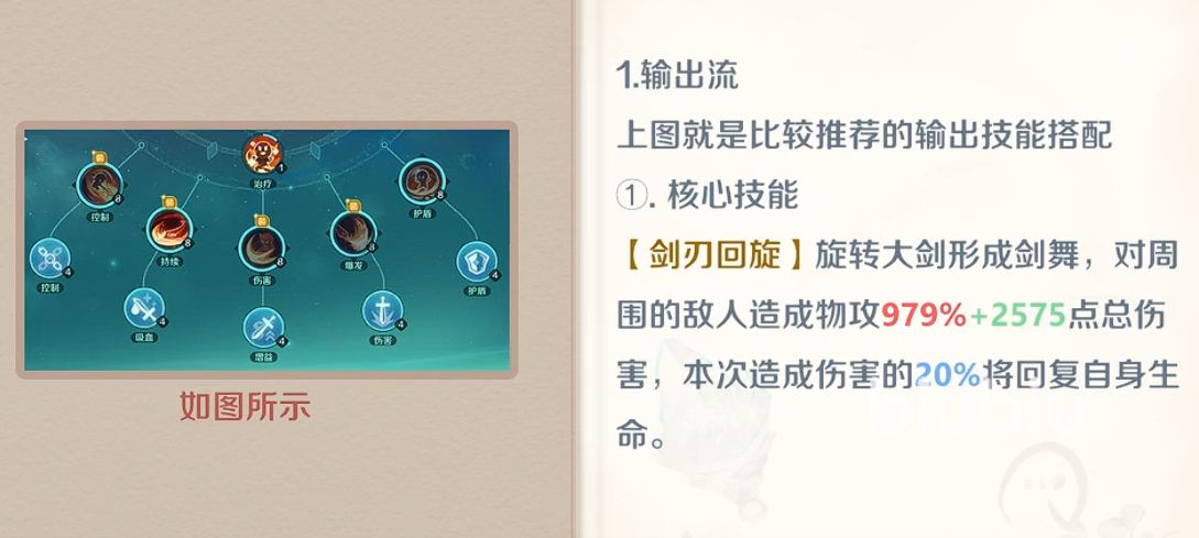 第一种为高爆发输出流,适合追求瞬间伤害的玩家。该流派的核心输出技能为剑刃回旋,可对周围敌人造成979%加2575点总伤害,并将本次伤害的20%转化为自身生命值回复。战术技能方面推荐搭配战狂路刃、星火冲击和流火之刃:战狂路刃向前发动重击,打击范围内的敌方单位;星火冲击则使角色冲向目标区域,造成物理攻击伤害并附加1秒眩晕效果;流火之刃沿路径释放火焰刀气,对沿途敌人造成物理伤害。被动技能首选生命复苏,受击后积累坚韧状态,叠满10层触发治疗效果。觉醒状态下推荐使用不屈觉醒,不仅能对周围敌人造成物攻伤害,还能在接下来9秒内提升普攻伤害109%,显著增强持续作战能力。