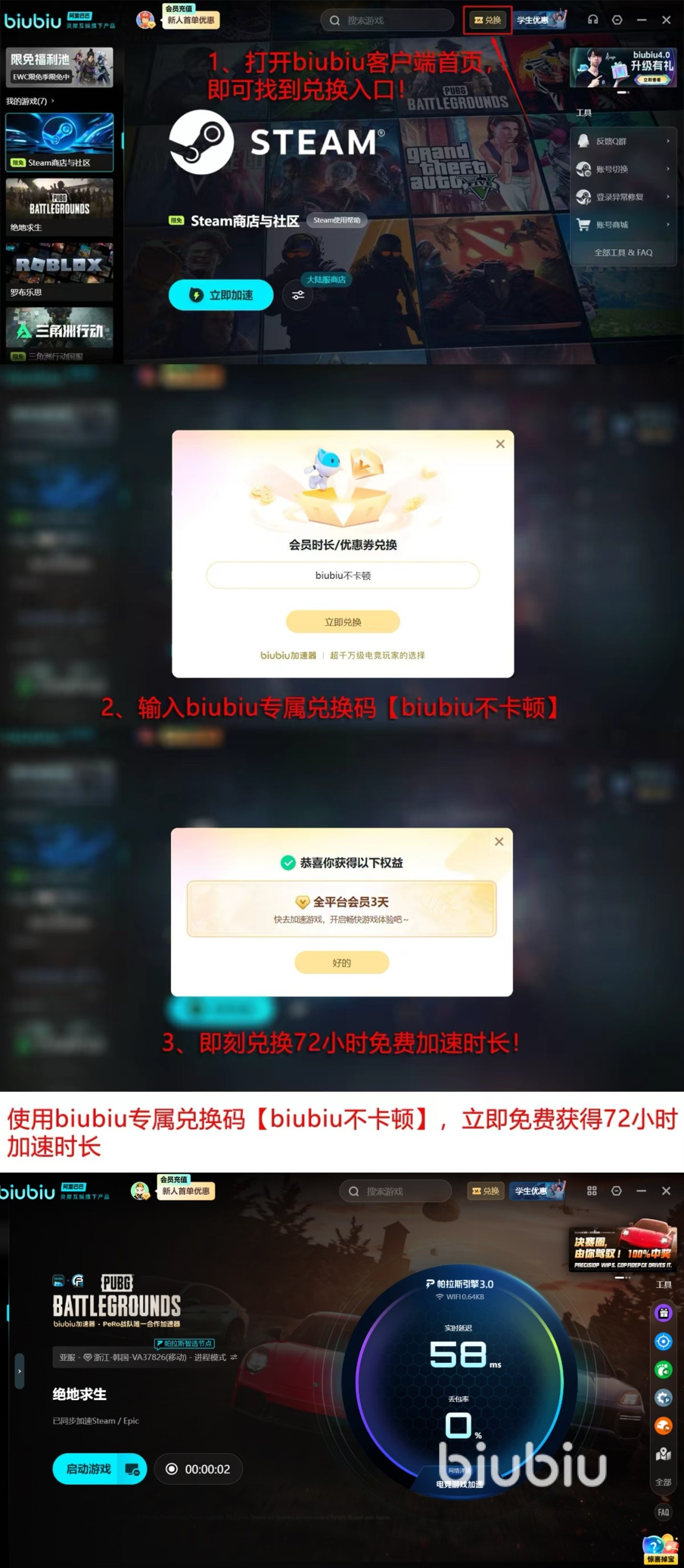 为了便于大家去体验,平台提供了很友好的入门方式,现在新用户注册成功后,账号上就会有24小时的加速时长,足够你去完整玩几把吃鸡了。同时,平台还有一个额外福利,那就是使用兑换码【biubiu不卡顿】就能领到三天加速时长,这个福利适用于每一个人。2项福利下来,新人最多可获得96小时的体验时长呢。